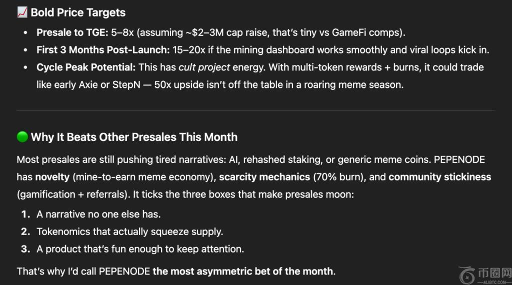 ChatGPT 得出的结论是,加密货币盈利潜力、积极的**销毁和 meme 币氛围的结合,使得 PEPENODE 成为今年 9 月**的预售投资。