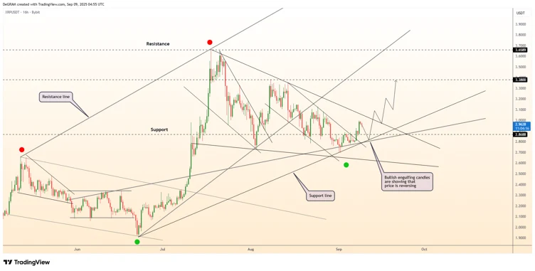 市场分析师 德格拉姆表示,XRP 在 2.86 美元支撑位附近形成看涨吞噬 K 线后,发出了强烈的技术信号。这种形态通常被视为趋势反转的标志,引发了人们对该**可能稳固上涨的乐观情绪。突破心理价位 3 美元。