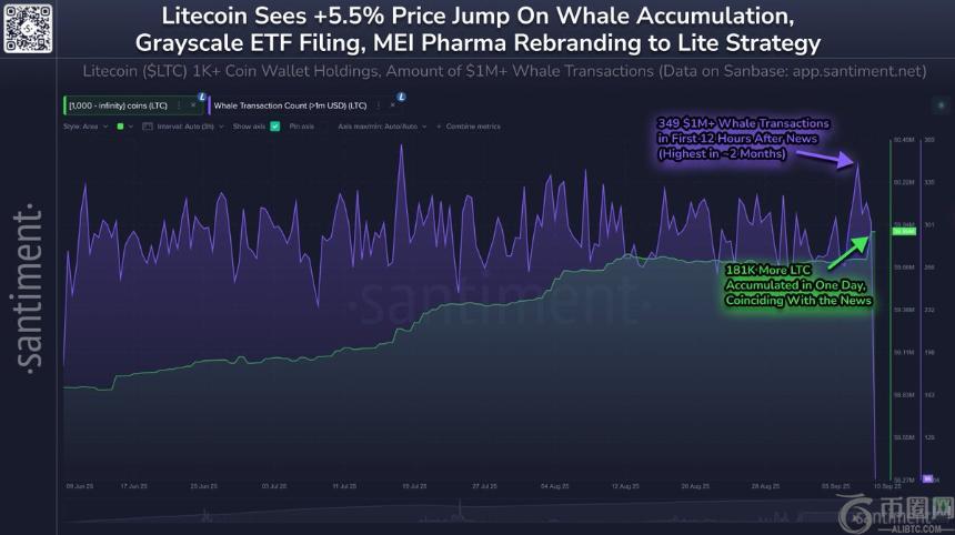 在一波看涨势头的推动下,莱特币(LTC)近期交易活动显著上升,并超越了多种山寨币的表现。数据显示,持有超过1,000个LTC的巨鲸钱包在一天内累计增持了18.1万LTC,这是近几个月来**的单日增幅之一。