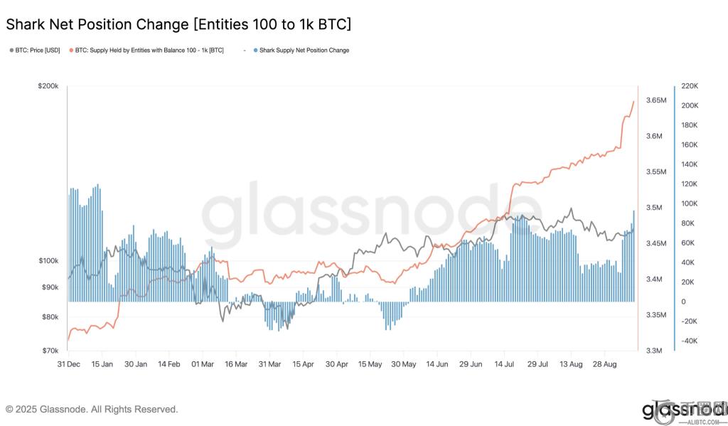 **数据显示,鲨鱼实体不仅在增持,而且增持速度创今年新高。鲨鱼净持仓变化已转为强劲正值,这意味着这些持仓者正在持续增持,而不是逢高抛售。这种增持在历史上通常先于比特币的重大牛市阶段出现,因为它反映了持有大量资金的实体的坚定信念。