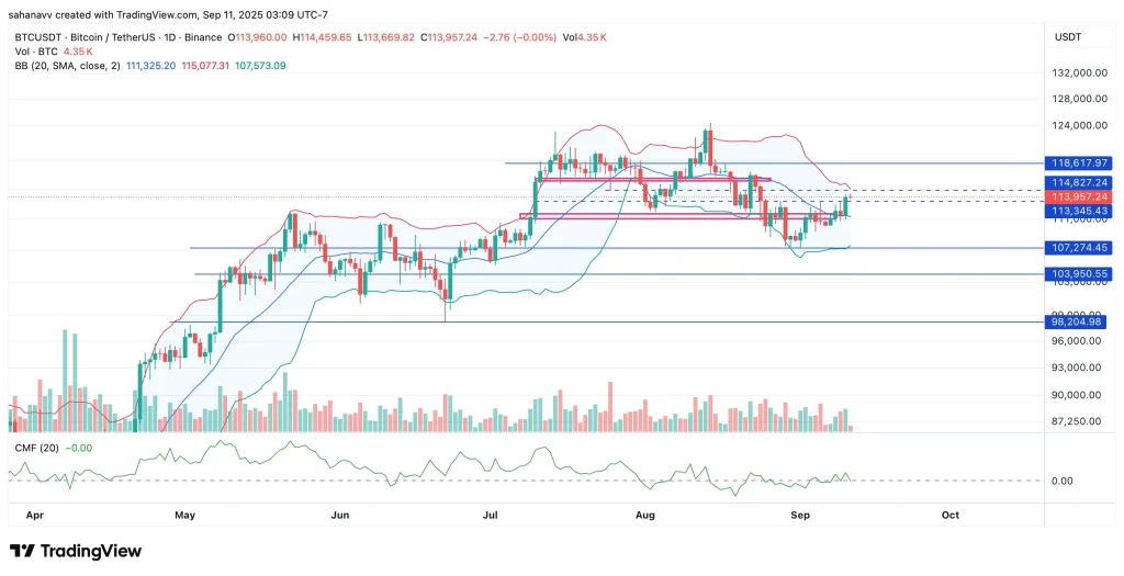 比特币目前守在关键的112,000美元支撑位上方,该支撑位在最近几周一直是强劲的需求区域。此外,最近突破113,800美元的涨幅吸引了整个平台的大量买盘。因此,势头已转向利多,预示着突破将持续。然而,要实现突破,BTC价格需要突破一个可能使其突破看跌影响的主要阻力位。