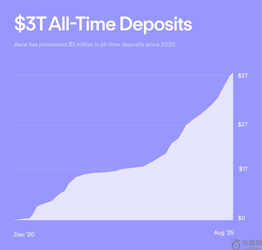 Aave 的累计存款已达到 3 万亿美元。Aave 的总锁定价值达 663 亿美元,占据了市场**地位。这一里程碑标志着 Aave 在证明去**化金融的实力和韧性方面迈出了重要一步。