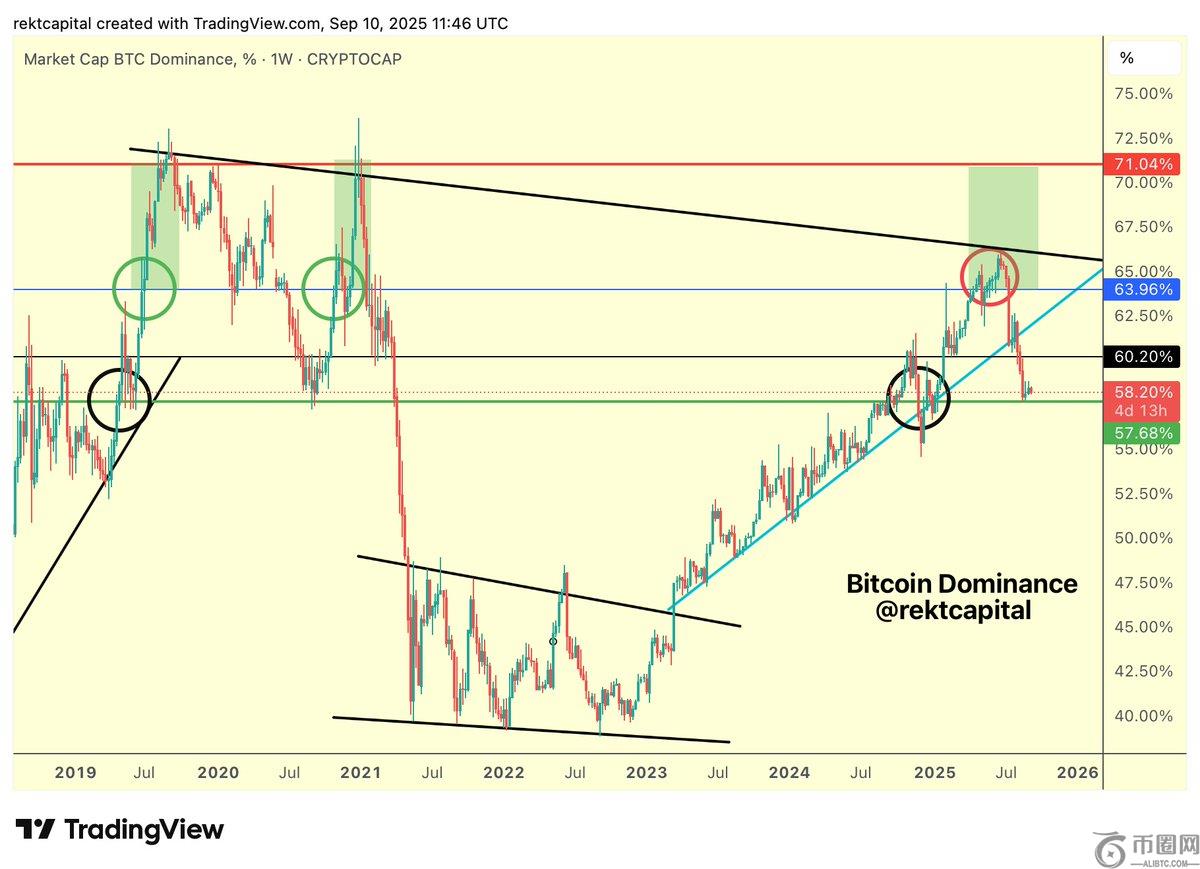 分析师表示,如果 BTC.D 失去 57.68% 的支撑位,山寨币可能会出现**性上涨。