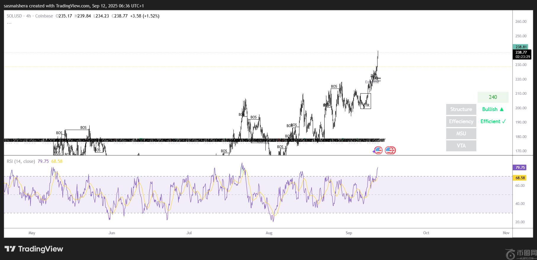 Solana 区块链的原生** SOL,在过去 24 小时内,是市值排名前 10 的加密货币中表现**的。该**的价值在过去 24 小时内上涨了 7.5%,目前交易价格为每枚 238.8 美元。
