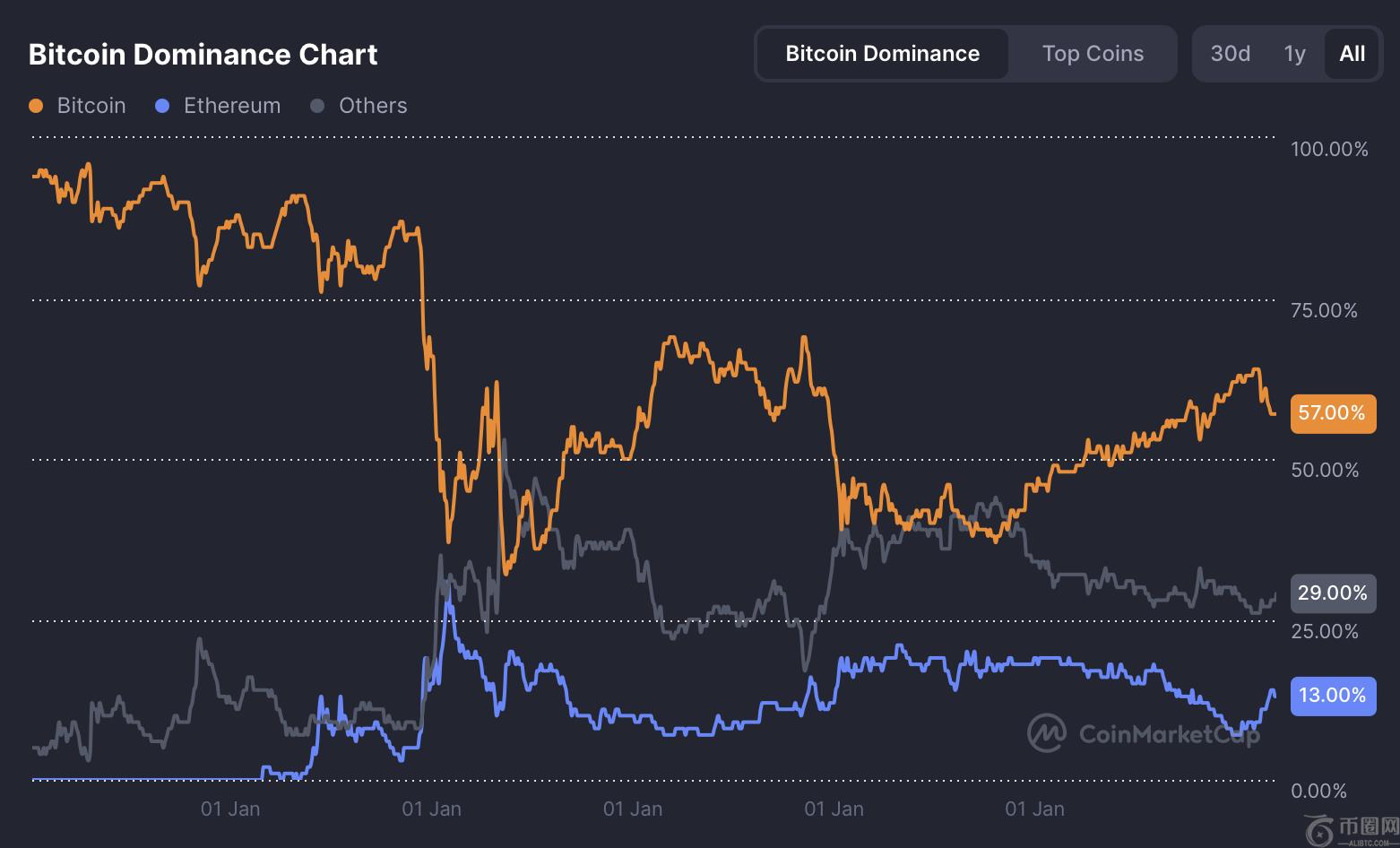 随着监管趋于建设性,以及ETF引导机构资金流入,尽管短期面临抛售压力,但比特币的基本面似乎仍得到良好支撑。如果即将到来的宏观催化剂齐头并进,分析师认为,到2025年**一个季度,比特币可能会延续其对山寨币的**优势。