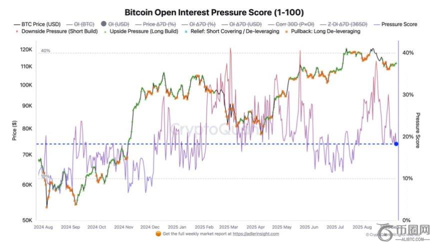 压力评分在识别潜在下行风险时尤为重要。Adler 指出,当该指标上升至 30% 至 40% 的区间时,表明空头仓位正在加速增加。在这种情况下,未平仓合约的增长速度会比平时更快,从而导致价格突然暴跌。目前,比特币尚未达到这一危险区域,但市场对市场情绪的变化仍然高度敏感。