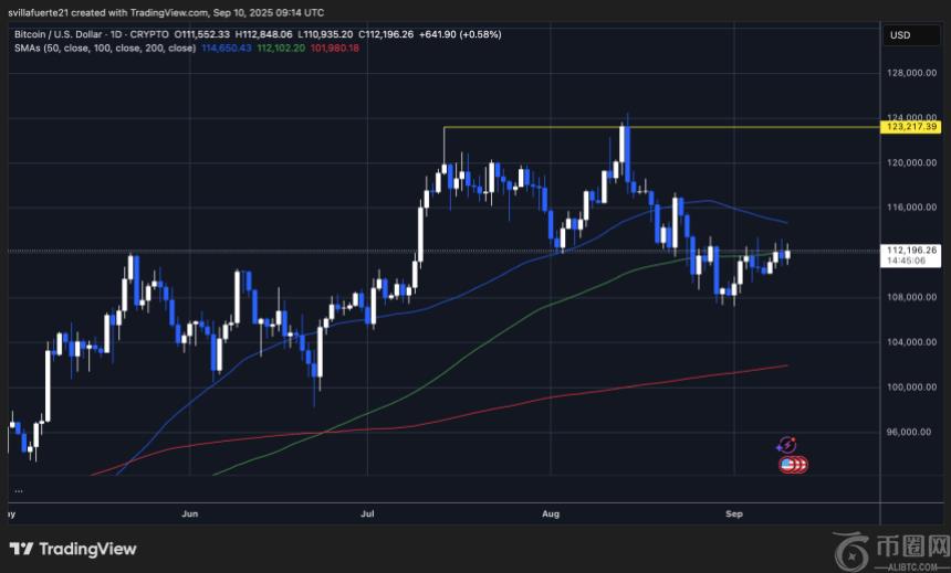 比特币目前交易价格约为 112,196 美元,在测试 110,000 美元附近的低点后呈现温和回升。图表突显了比特币正处于盘整阶段,其价格守在 100 日简单移动平均线 (SMA) 上方,位于 112,102 美元,而 50 日 SMA 位于 114,650 美元上方,构成直接阻力位。若比特币**收于该水平上方,则可能开启重新测试 116,000 美元的道路,并有可能挑战夏季高点 123,217 美元的主要阻力位。