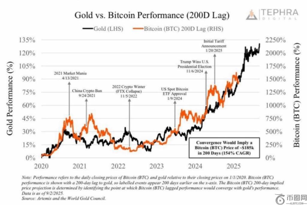 历史数据甚至表明比特币通常滞后黄金约 200 天。