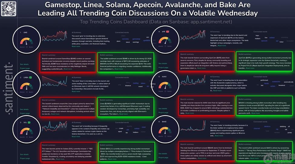 市场活动支持了这种转变。社交和交易数据显示,Solana (SOL)、Avalanche (AVAX)、ApeCoin (APE)、Linea 和 Bake 等**正在**讨论。