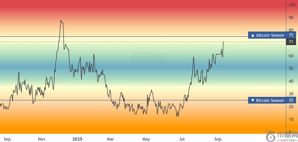 随着山寨币季节指数接近 71,接近 75 的触发点,势头明显正在转变。