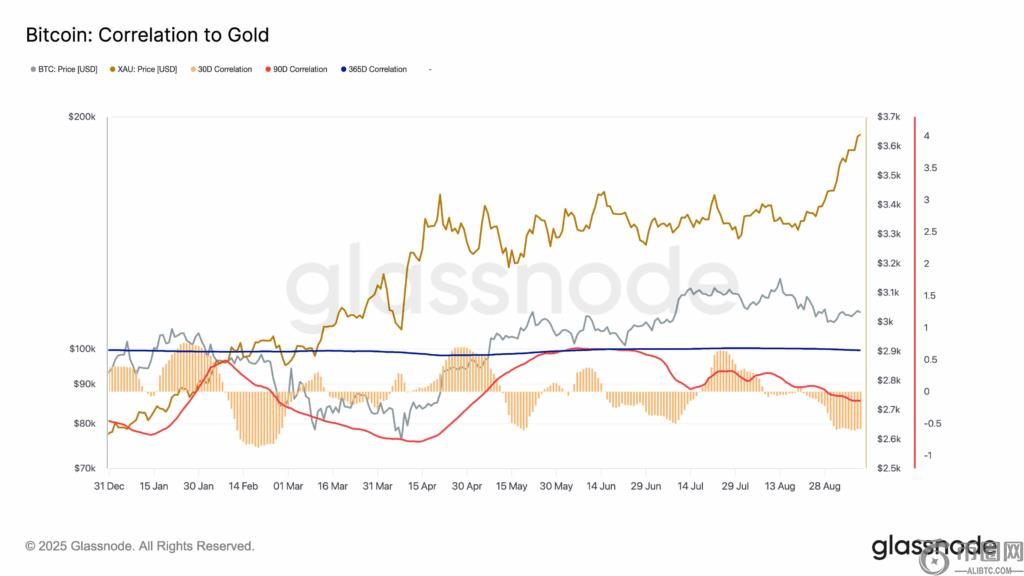 但今天的数据却讲述了一个不同的故事。根据Glassnode的数据,黄金和比特币之间的30天相关性为-0.53。