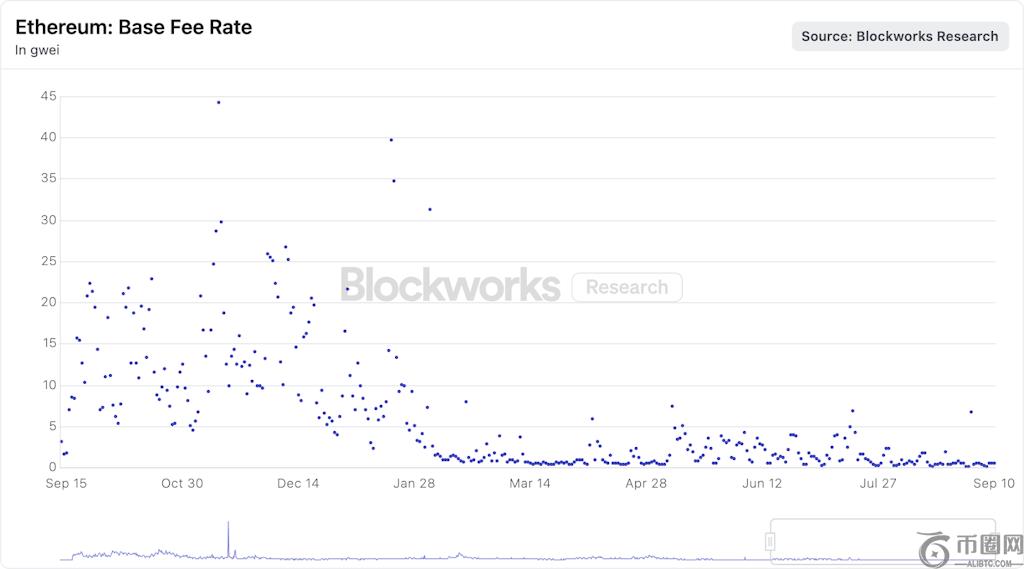 4. 基础费率(gwei):费用下降主要得益于基础费用的压缩,目前大多数日子里费用都降至 1-3 gwei 左右。峰值很快消退,表明**市场容量持续过剩,而且这些费用比一年前更加可预测。