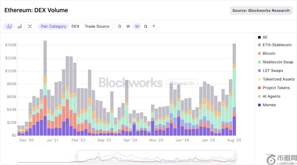 7. DEX交易量(交易对组合):8 月份价格飙升至周期高点;ETH 稳定型和稳定型稳定型占据主导地位,表明交易强度在大部分情况下没有费用压力的情况下有所上升。推出WLFI2025 年 9 月 1 日证明是一个显著的例外!