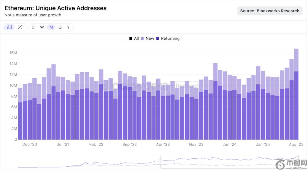 2. **活跃地址:创下多年来新高,新增地址占比更高。这并非用户指标,但对长期而言具有方向性支撑作用。