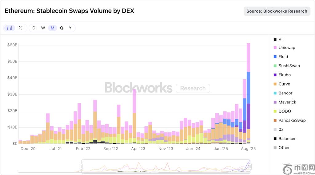 8. DEX 的稳定币互换:这就是今年夏天的热点。稳定币掉期交易量一路飙升。Uniswap 依然排名**,但是体液 和 艾库博股票正在增长。