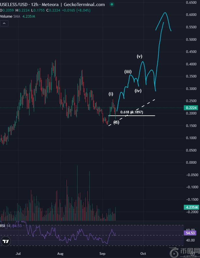 接下来是无用的硬币(无用) memecoin。根据在Bluntz看来,USELESS已经完成了一次回调,即将迎来“**上涨”。根据Bluntz绘制的USELESS 12小时图,他似乎认为该memecoin可能从当前价格上涨约140%,创下约0.60美元的历史新高。