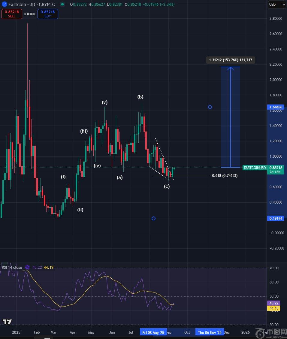 布朗茨经常将艾略特波浪理论应用于技术分析,他表示,Fartcoin 已经完成了三浪回调,即向下反转,**在 61.8% 斐波那契回撤位结束。艾略特波浪理论指出,资产价格的主要趋势呈现五浪形态,而回调则呈现三浪形态。