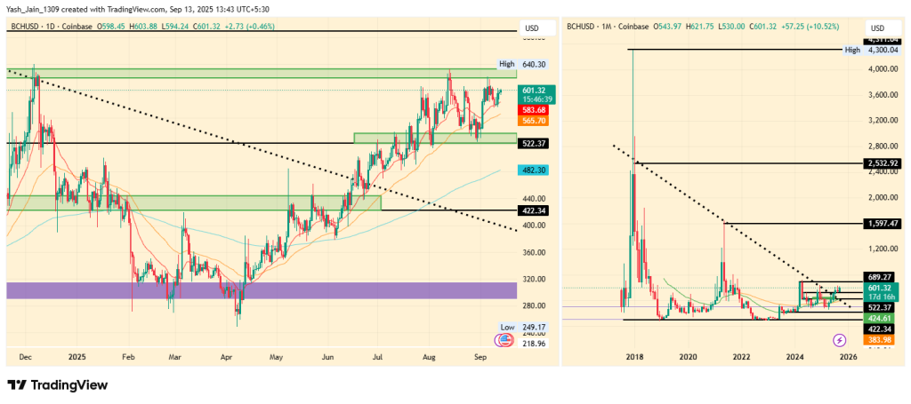 受整体市场乐观情绪和比特币屡创新高的推动,BCH 自 4 月起迎来强劲反弹,从 249 美元的低点一路飙升至 8 月的 640 美元高点。此次反弹已形成多个连续看涨的月线 K 线,标志着 BCH 突破了“1 个月”时间框架图上的长期下降三角形形态。此次突破预示着 BCH 未来可能迎来更大规模的反弹,甚至可能重创历史高点。