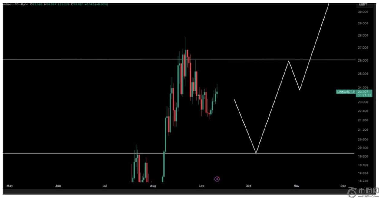 与此同时,Chainlink 的原生** LINK 交易价格约为 23.70 美元,正处于关键时刻。日线图显示,在 8 月底大幅回调后,LINK 价格呈现盘整状态,交易员们正在关注其涨势是突破 26 美元关口,还是回落至 20 美元。