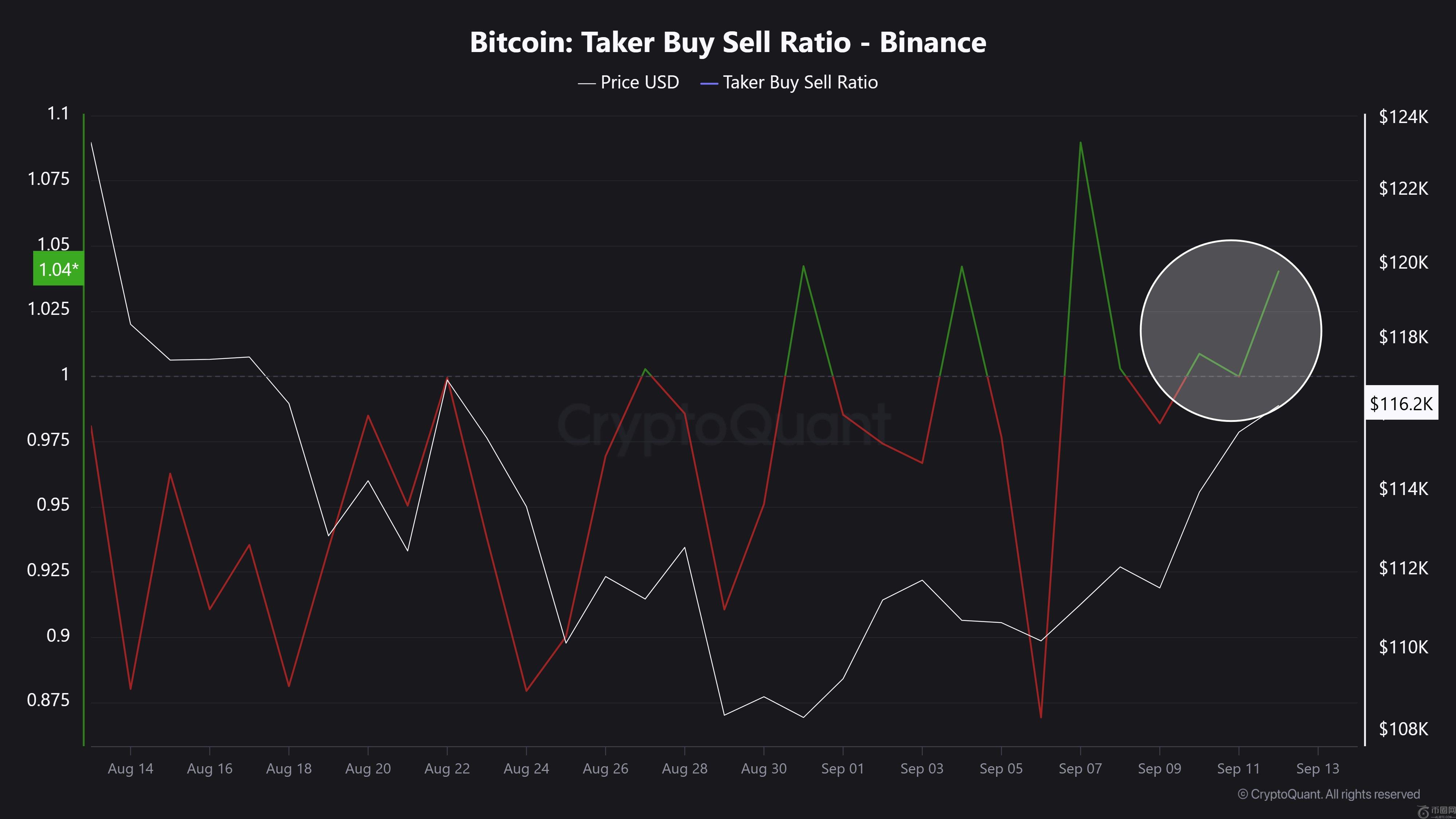 加密货币分析师 Burak Ke**eci 在 9 月 12 日 X 平台上的一篇文章中表示共享令人兴奋的链上视角支撑了比特币价格日益增长的看涨情绪。据在线专家称,全球**加密货币交易所的Taker买**率已连续三天保持正值。