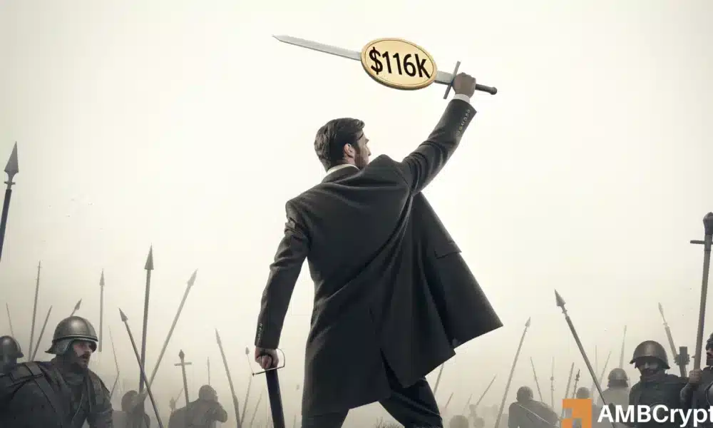 比特币[BTC]正接近 116,963 美元的重大供应壁垒。在这个水平上,大约 534k BTC,或流通供应量的 2.68%,面临盈亏平衡的风险。
