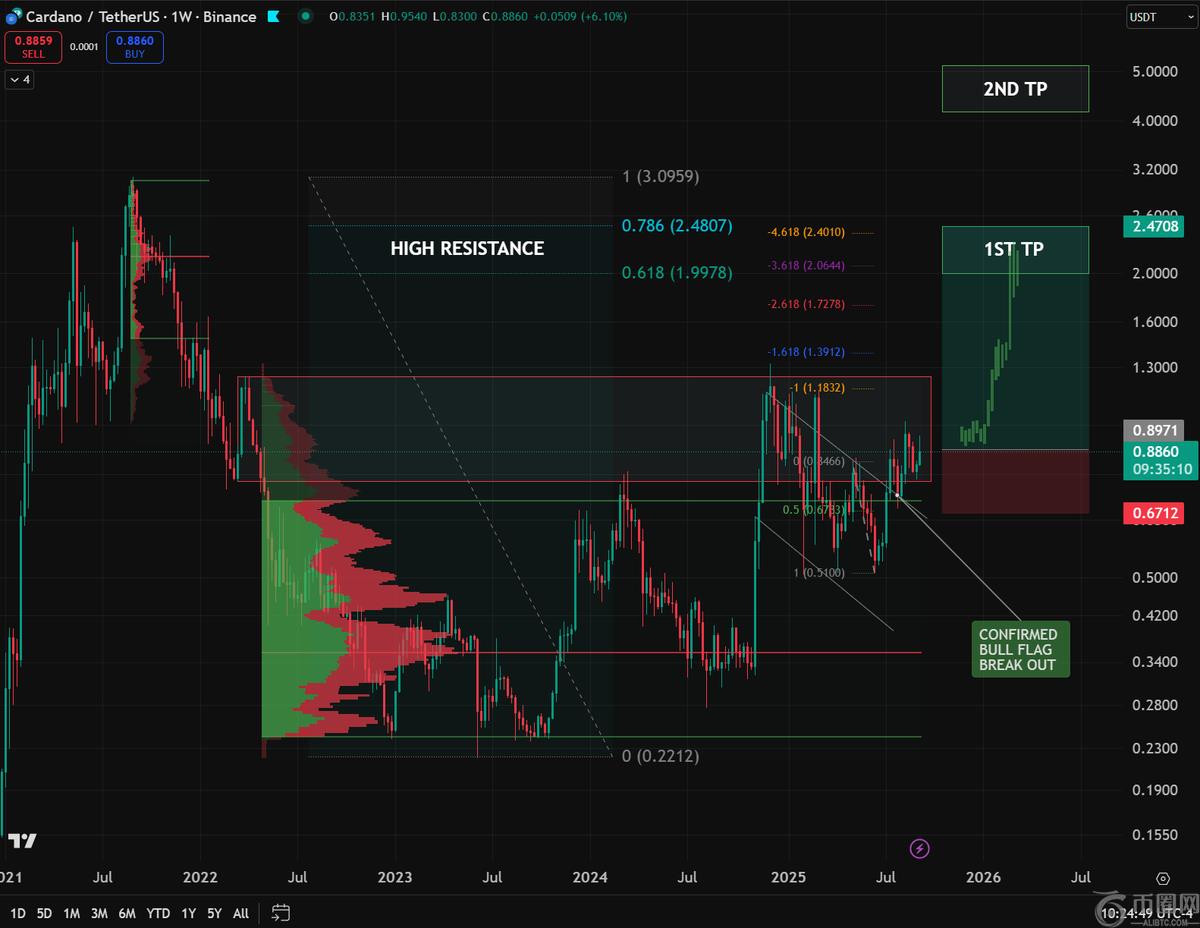 图表概述了两个主要的上行目标。**个目标(**个目标价)设定在 2.47 美元左右,与 0.786 斐波那契回撤位一致。突破该区域后,可能开启通往第二个目标(第二个目标价)5.00 美元附近的道路,这意味着价格可能从当前 0.89 美元左右上涨数倍。分析师将这种情况描述为“前景光明”,如果 ADA 能够确保周收盘价高于阻力位。
