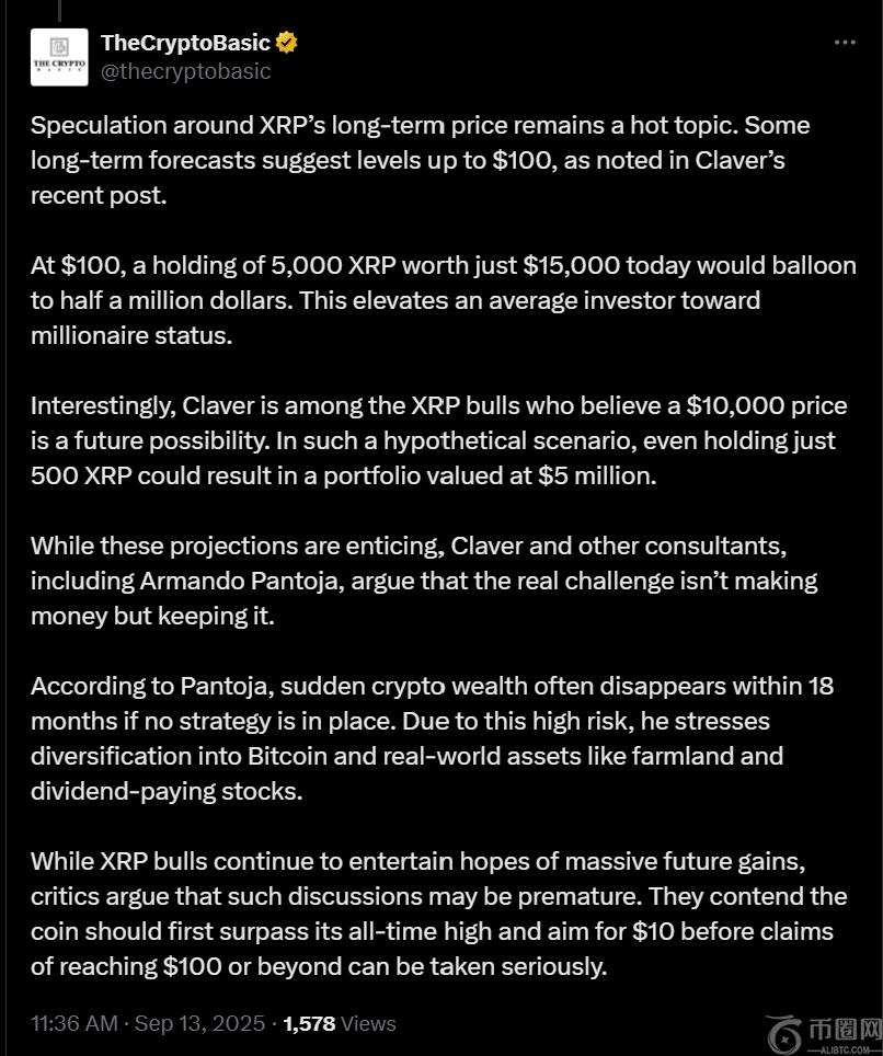 然而,高流通量意味着高目标难以实现。最值得关注的一点,或许是 100 美元的 XRP 价格标签,是一个更合理的预测。