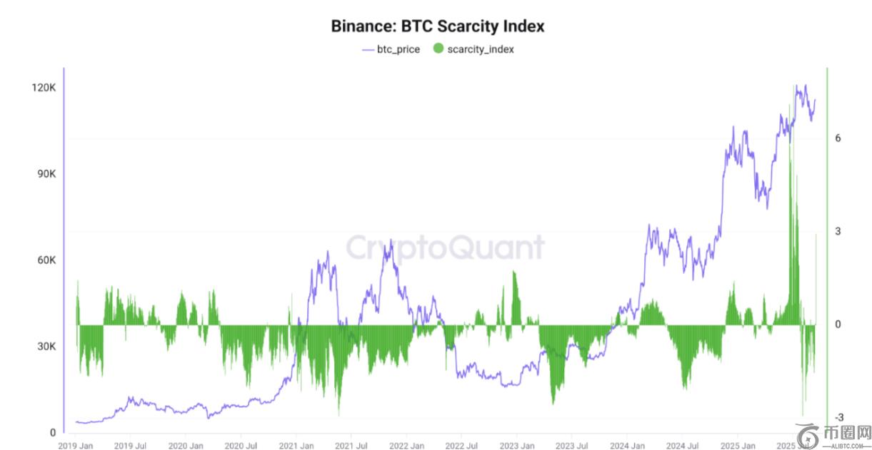 CryptoQuant 数据显示,比特币缺乏的指数在周日突然上涨,这是自去年六月以来的**。突然上涨通常意味着大量比特币从平台上撤出,或者卖单大幅下降,导致可用供应突然减少。从历史上看,当该指标上涨并连续数日保持正值时,BTC价格就会大幅上涨,例如在6月份,BTC**上涨至12万美元。
