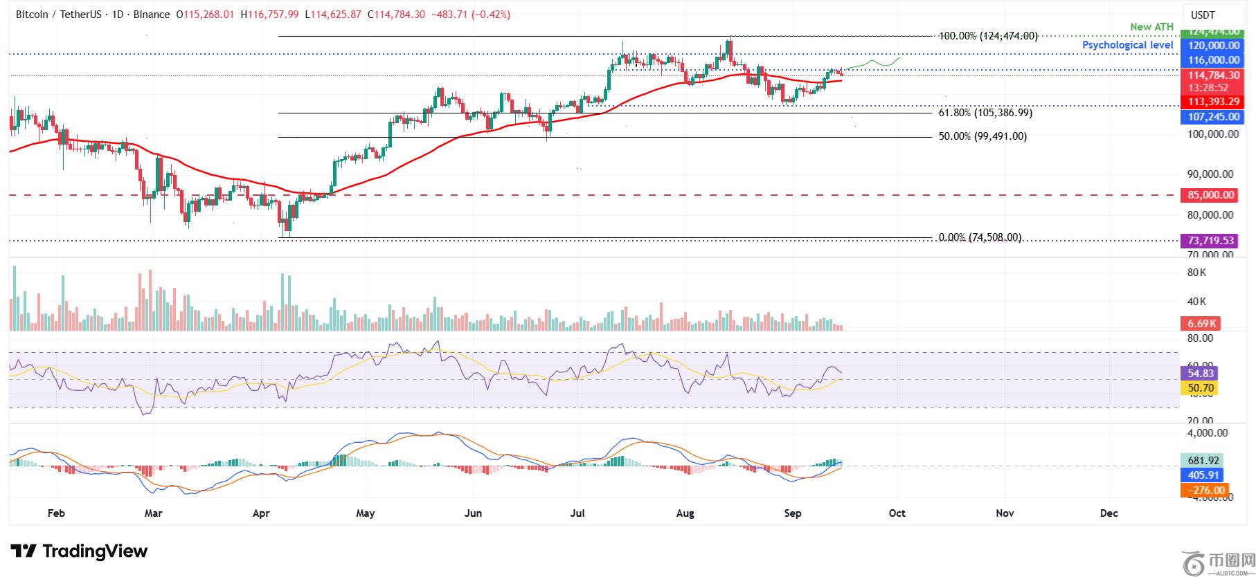 Bitcoin价格连续第二周上涨,上周上涨了3.72%。然而,周六在116,000美元的日线阻力位附近遇到阻力,第二天略有回落。截至周一撰写本文时,价格仍在116,000美元的日线阻力位附近徘徊。