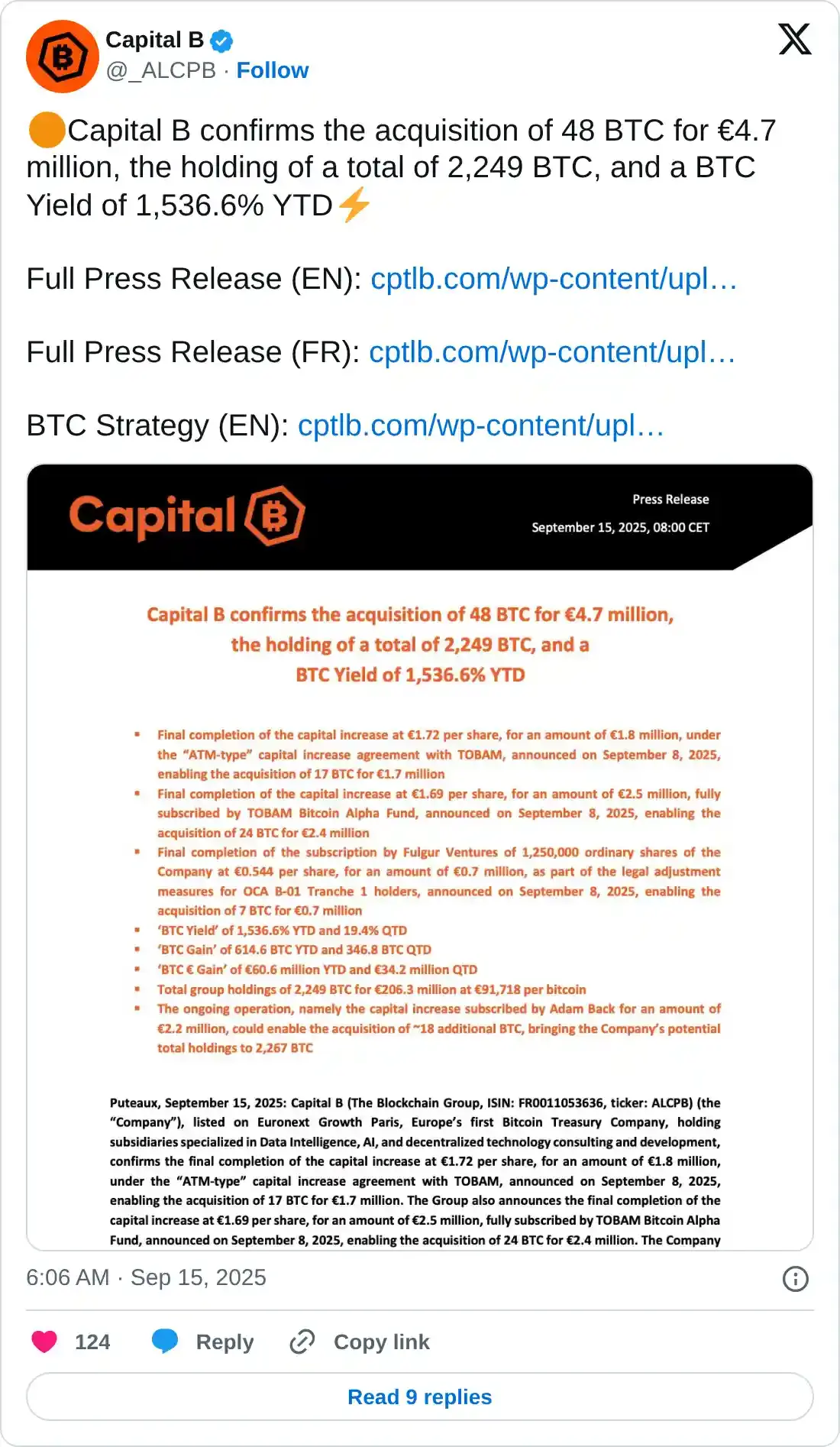 除了机构投资者的强劲流入外,企业对比特币的需求也依然强劲。Capital B 周一宣布,该公司已增持 48 个比特币,总持仓量达到 2,249 个比特币。同期,比特币Treasuries.NET数据显示,上市医疗保健公司 Prenetics 增加了 40.6 个 BTC,并宣布计划每天增持 1 个 BTC——该公司目前共持有 228 个 BTC。