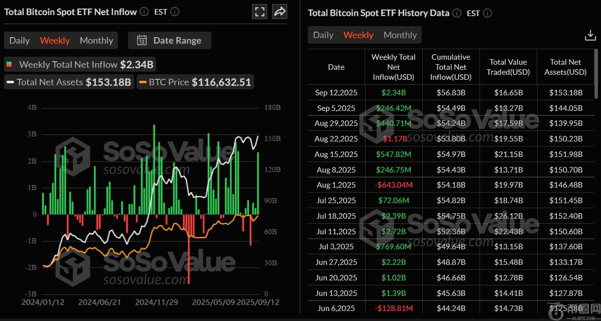 机构投资者为比特币价格的复苏做出了贡献。根据SoSoValue的数据,如下图所示,比特币现货交易所交易基金(ETF)上周共计流入23.4亿美元,连续第三周录得正流入。这**入量创下7月中旬以来的**水平,表明机构需求复苏。如果这种流入持续并加剧,BTC价格可能会进一步回升。