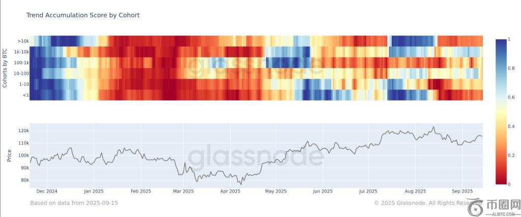 自我们8月25日更新以来,比特币的市场动态出现了微妙的变化,但总体趋势依然谨慎。抛售(持有者抛售比特币)略有减弱,表明部分抛售压力正在缓解,但尚未转化为强劲的买盘。大多数BTC持有者(按其入手时间划分)的持币群体比例仍低于0.5的门槛,这表明持有者并未积极增持。