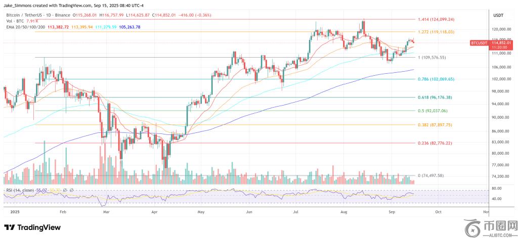 截至发稿时,比特币交易价格为 114,852 美元。