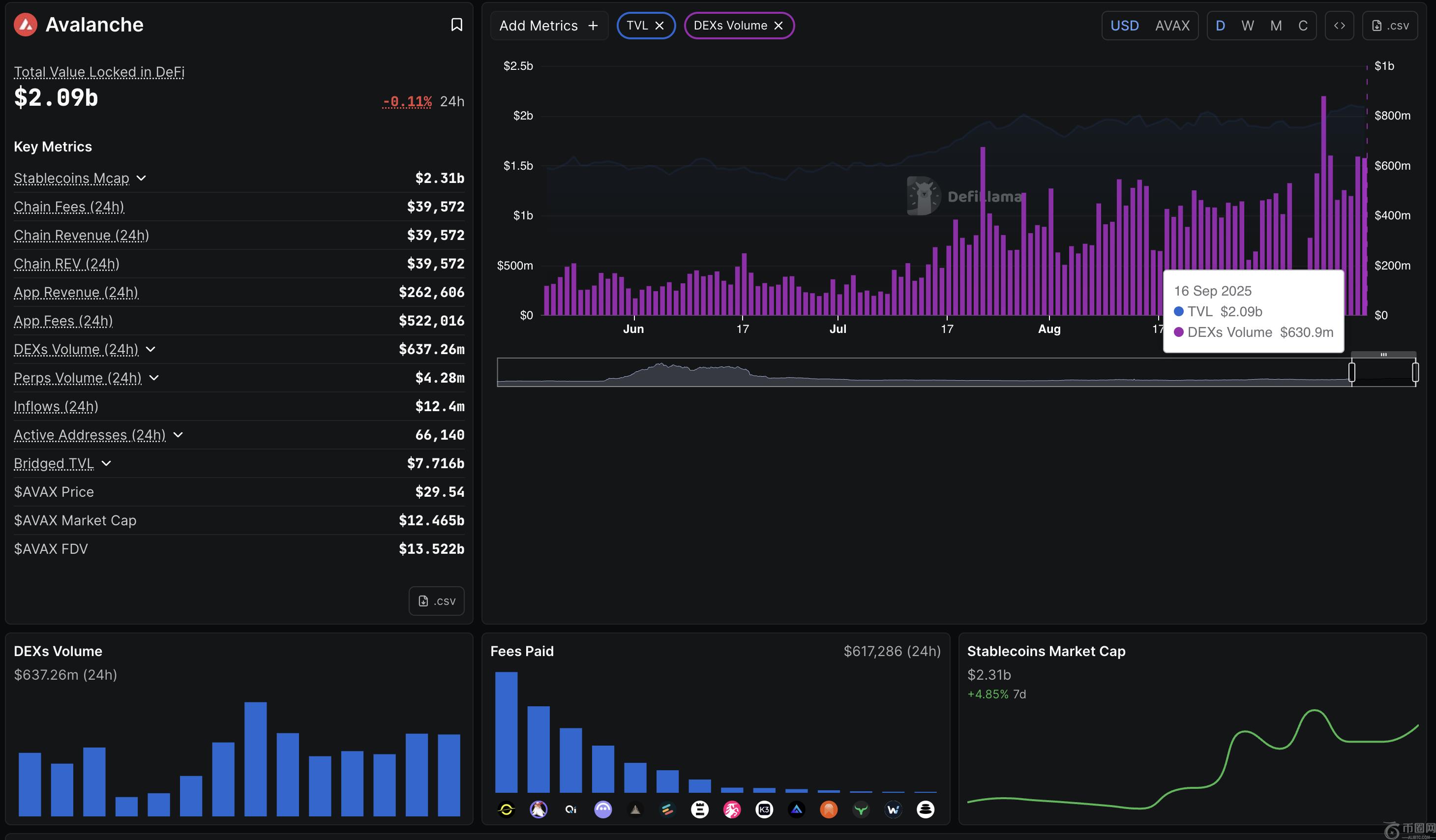 DeFiLlama 数据显示,Avalanche 生态系统的总锁定价值 (TVL) 为 20.9 亿美元,高于上周的 19.25 亿美元。网络上分配的数字资产数量的增加表明用户活跃度显著提升。