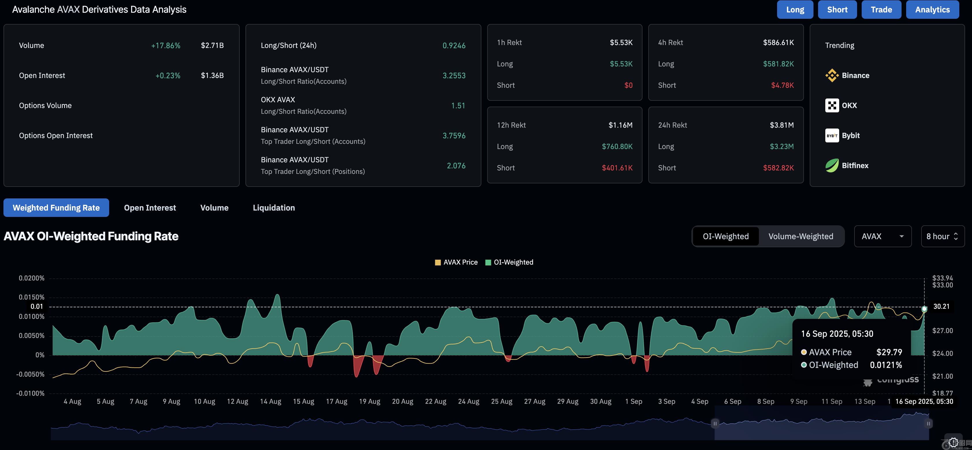 不过,CoinGlass 数据显示 AVAX 未平仓合约 (OI) 小幅增加,达到 13.6 亿美元,这表明由于投资者预期进一步上涨,资本流入有所增加。