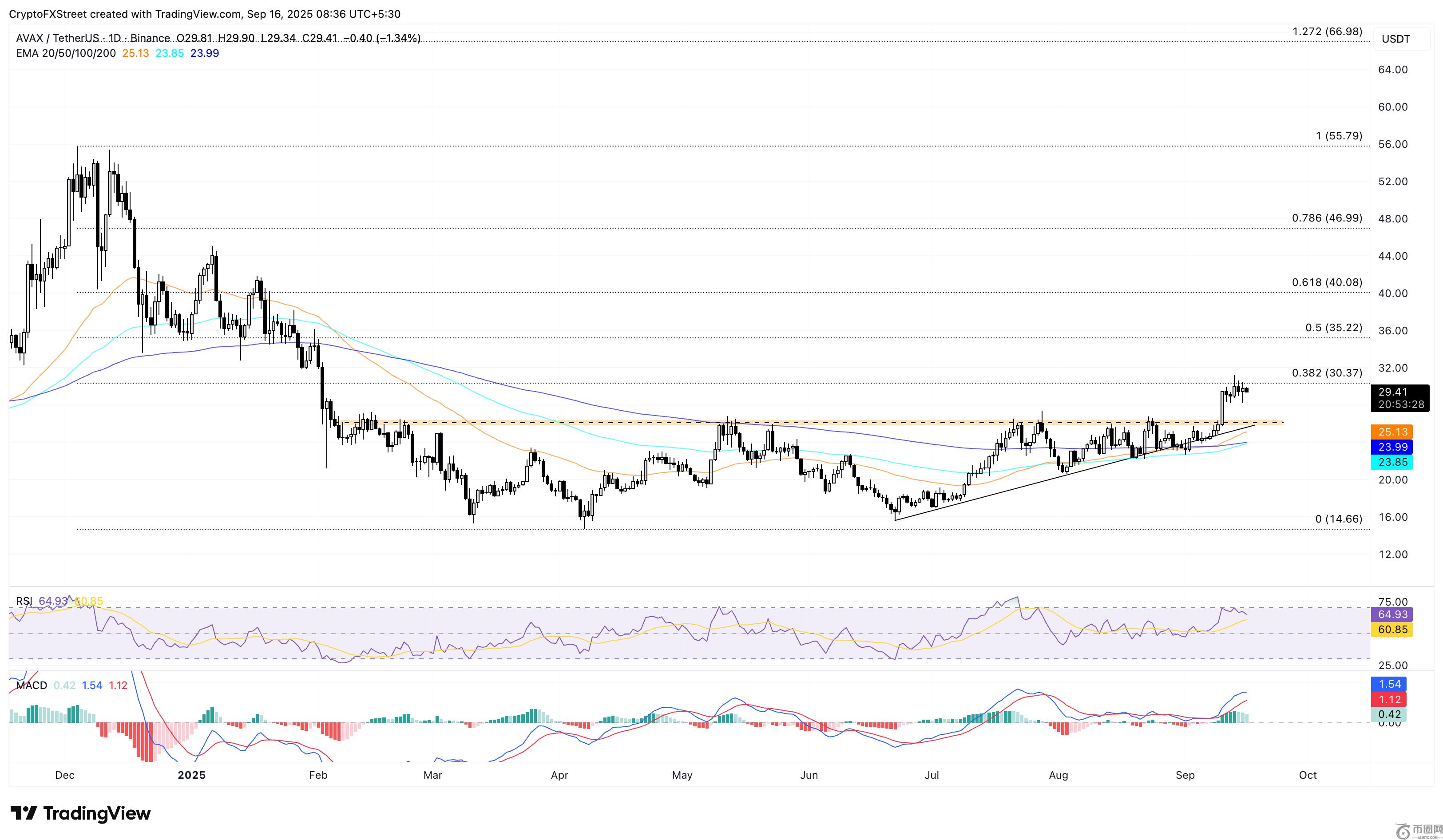 如果 AVAX 突破 30.37 美元的水平,则可能延续涨势至 50% 回撤位 35.22 美元。