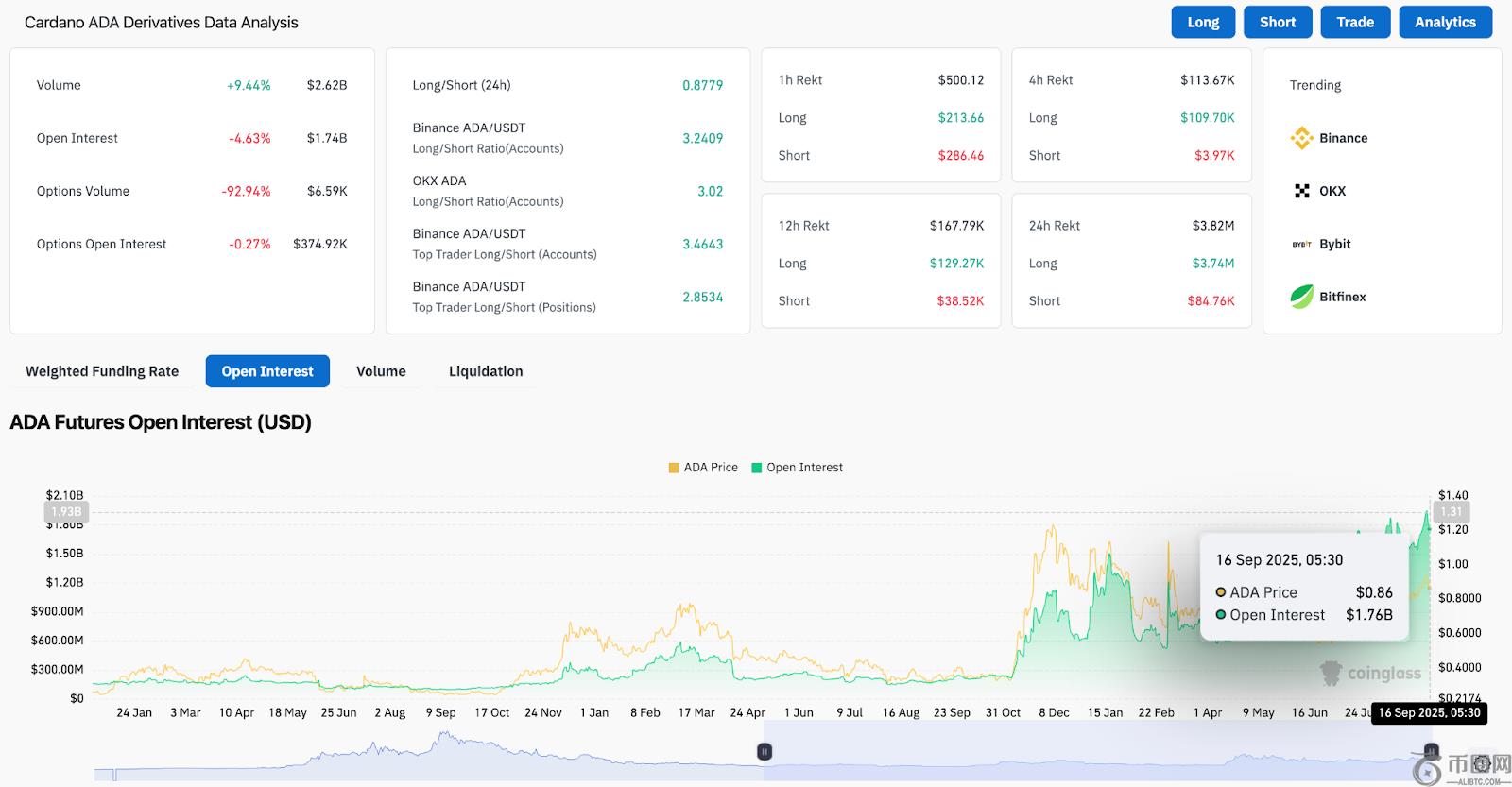 链上和期货数据显示持仓谨慎。过去24小时内,未平仓合约下滑4.6%,至17.4亿美元,反映出随着价格回落,持仓规模有所缩减。与此同时,期货交易量增长近9.5%,至26.2亿美元,表明交易员正在轮换持仓,而非**退出。