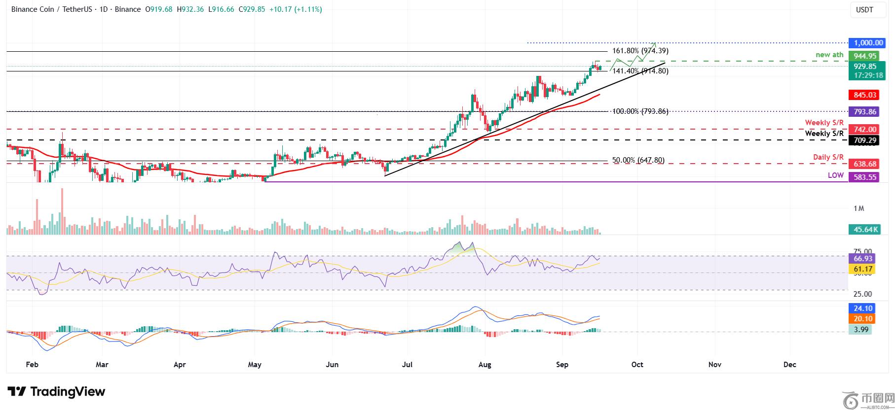 如果 BNB 继续反弹并收于 944.45 美元的历史高点上方,则其涨势可能延续至 1,000 美元的心理关口。