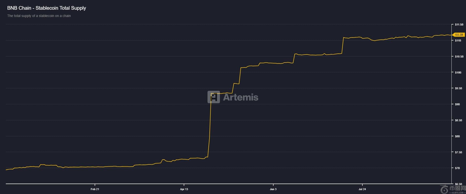 除了总锁定价值 (TVL) 上升之外,Artemis 终端数据显示,BNB 的稳定币总供应量自 7 月中旬以来持续上升,目前已达到 112 亿美元。BNB 项目的稳定币活跃度和价值增长表明市场看涨。前景因为它们可以促进网络使用并吸引更多用户加入生态系统。