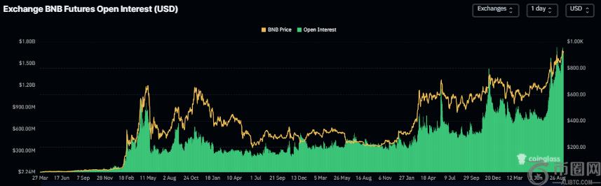 在衍生品方面,周二,BNB 期货在各交易所的未平仓合约 (OI) 达到 16.6 亿美元,接近历史高点。OI 的上升表明有新的或额外的资金进入市场,并有新的买盘涌入,这可能会推动 BNB 价格的上涨。