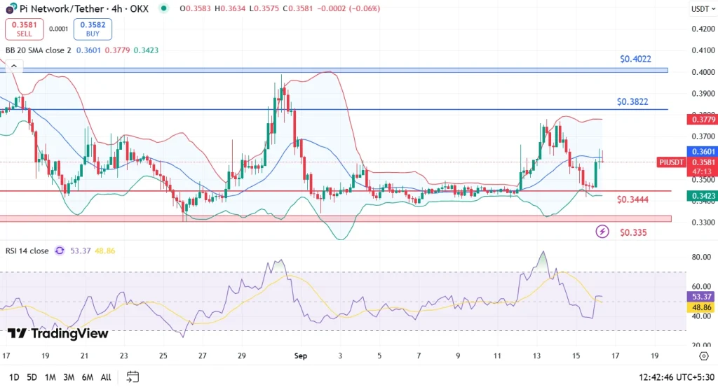 Pi Network 的价格是多少美元?目前,Pi Network 价格(美元)为 0.3597 美元,阻力位在 0.382 美元附近。