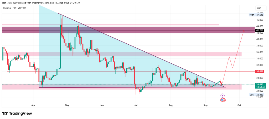 因此,如果出现重大催化剂推动新一轮反弹,BSV 可能飙升至 35 美元。突破这一水平后,可能开启重新测试 45 美元高点的大门。