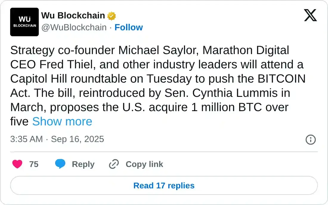 包括 Strategy 联合创始人 Michael Saylor 和 Marathon Digital **执行官 Fred Thiel 在内的**加密货币**将于周二齐聚国会山圆桌会议,推广《比特币法案》。