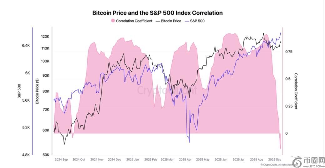 CryptoQuant 数据显示,比特币价格走势再次与标准普尔 500 指数脱钩,这是一年来的**。该指数周一收于 6,600 点上方,创下历史新高,而 BTC 则在当天收于 116,000 美元以下。从历史上看,当 BTC 与标准普尔 500 指数出现此类背离时,BTC 随后会迎头赶上,甚至跑赢大盘。如果历史重演,当前的脱钩可能暗示,一旦比特币重拾动力,它就将迎来强劲反弹。