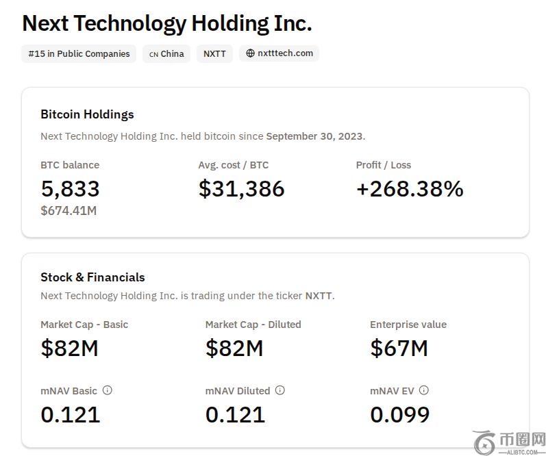 根据报告和监管备案Next Technology 的记录显示,其持有 5,833 枚比特币。该公司 2025 年 3 月的 10-Q 报表显示,其持有的比特币账面价值约为 4.8 亿美元。