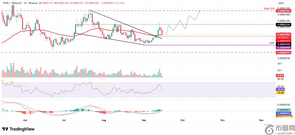 PEPE 币的前景有所增强,因为该**周四突破了下跌楔形形态,并在突破后的两天内上涨了超过 11%。此次 memecoin 的反弹走势为 PEPE 提供了潜在的上涨空间,有望突破 0.0000124 美元的日内阻力位,目前在 0.0000107 美元至 0.0000105 美元之间有增持机会。