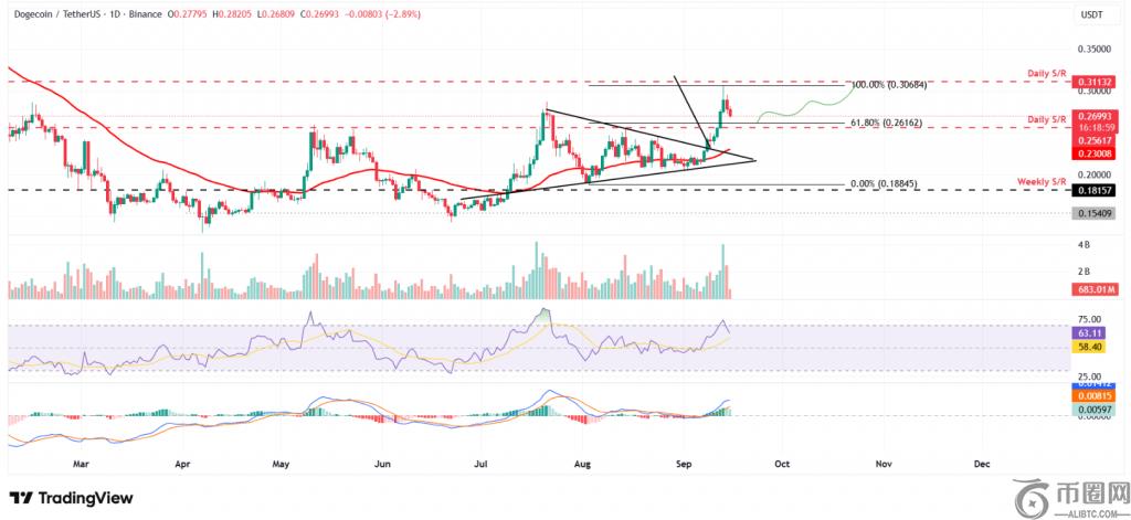 场外投资者可以在每日支撑位 0.256 美元处增持狗狗币,相对强弱指数目前为 63,表明仍有上涨空间。移动平均收敛散度指标 (MIF) 上周呈现看涨交叉,绿色柱状图上升,这支撑了狗狗币在近期回调后仍能延续上涨趋势。
