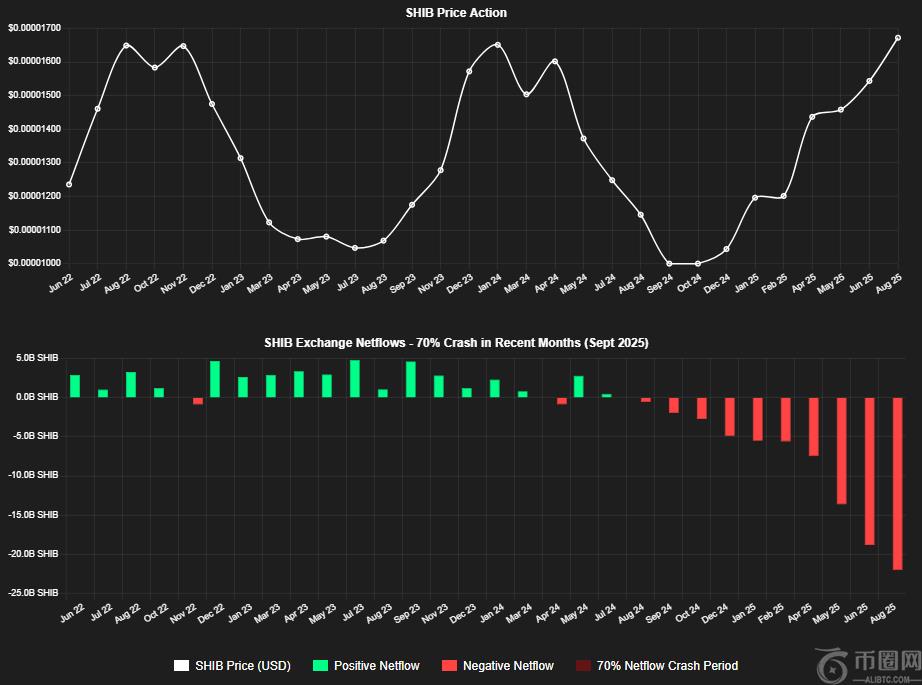 SHIB 交易所余额趋势和流入数据可视化,显示价格走势和 70% 暴跌后的净流量 -