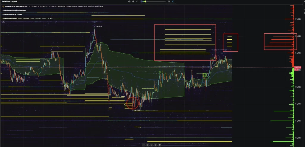 BTC 订单簿热图Coinglass目前,流动性在 116,200 美元至 116,500 美元之间明显集中,这表明这是一个值得交易者关注的关键区域。当流动性聚集在一个窄幅区间时,它通常会像磁铁一样吸引价格走势,将 BTC 拉向该水平。如果这些主要是买单,那么这个区间可能是一个强劲的支撑区域,买家准备在此吸收抛售压力,并阻止价格进一步下跌。