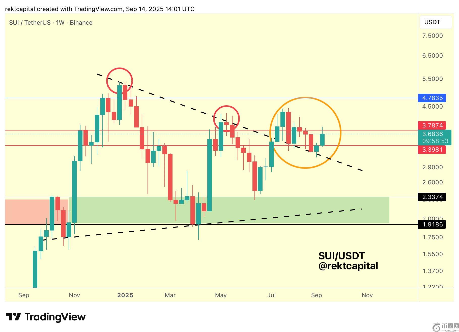 “SUI 继续成功突破宏观三角形顶部并重新测试,获得新的支撑。